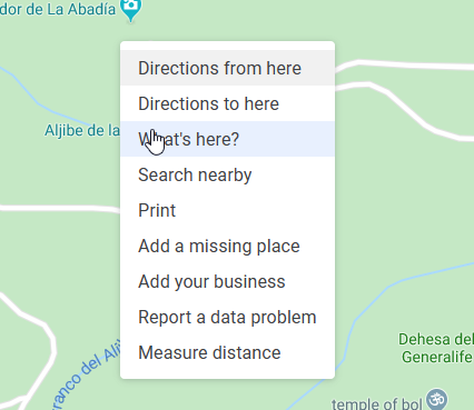 If you don’t have the coordinates to hand, one way to find them is to use Google Maps. You can right-click on the place on Google Maps and select “What’s here”: