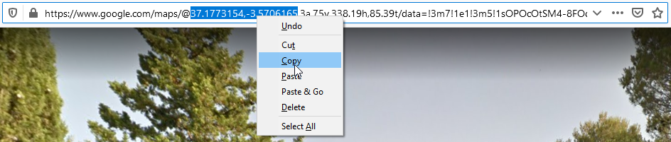 However, it can be tricky to select those coordinates to copy and paste them into the blue textbox. Another way to do this is to find the panorama in Google Street View and copy the coordinates from the URL in the browser’s address bar. They are the pair of numbers after the @ sign, and you can select them by clicking and dragging the mouse cursor:
