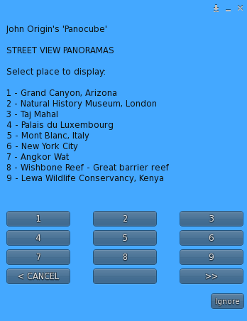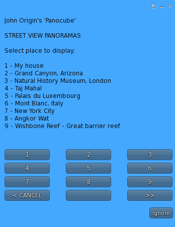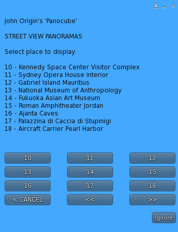This option lets you load a saved panorama from a list. The Panocube comes ready with a set of 50 interesting panorama locations (Places) around the world, and you can add your own to this list (see the [[#Save|Save option]] below).