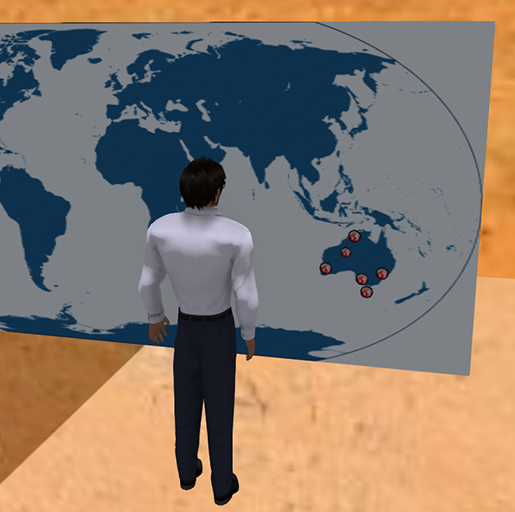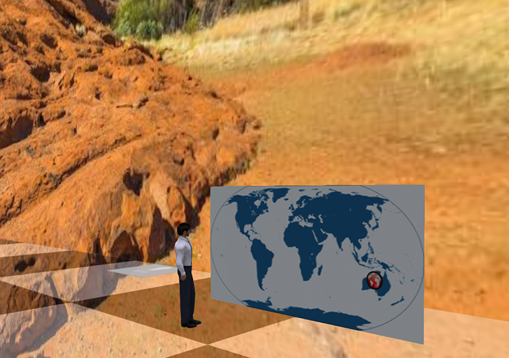 The Panorama locations object is a circular object that can be placed on World map, Globe, or any other RezMela objects. It is used to store a panorama location, similar to the Places menu but visible and accessible in your RezMela scene.