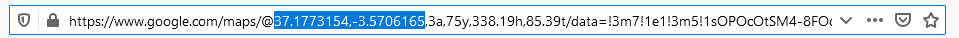 However, it can be tricky to select those coordinates to copy and paste them into the blue textbox. Another way to do this is to find the panorama in Google Street View and copy the coordinates from the URL in the browser’s address bar. They are the pair of numbers after the @ sign, and you can select them by clicking and dragging the mouse cursor: