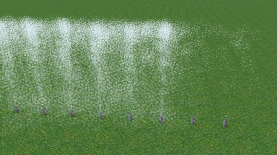 Note also that the OpenSim viewer can only display a number of particles at once, according to the graphics configuration. The higher quality your viewer’s graphics settings, the more particles it will display. So if you have a large number of water jets in your scene, you might notice that some of them produce less “water” or even none at all. In this example, the jets on the right are not working properly because there are many fountains in the scene and the graphics settings are reduced: