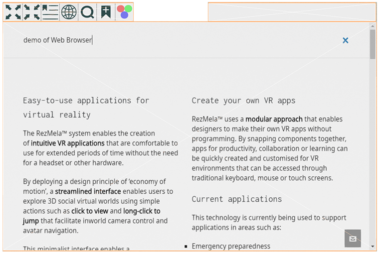 The Web Browser object, as its name suggests, is a way of bringing the World Wide Web into your RezMela scenes. It is based on Google’s Chrome browser, and has much of the functionality of a desktop or mobile browser, along with some extra features for RezMela.