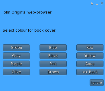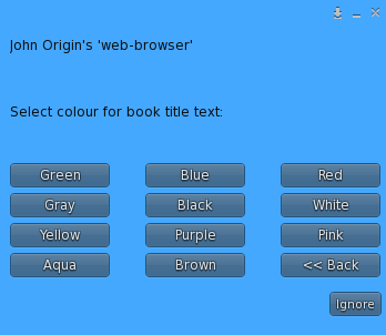 From there, you can select the color you wish for the text of the title on the book, or “<< Back” to go back to the first menu.